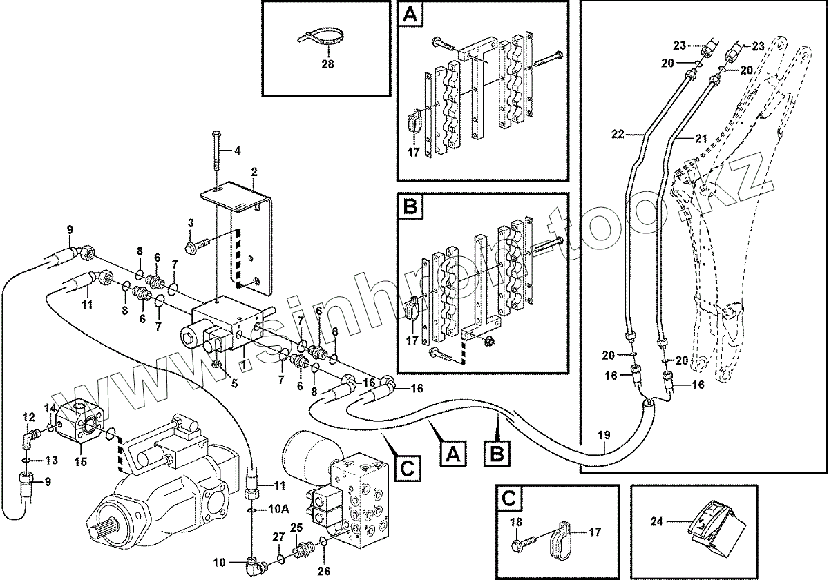 Каталог запасных частей к технике: Volvo BL71. 11891323, 11891351, 11891362 Hydraulic attachment bracket digger