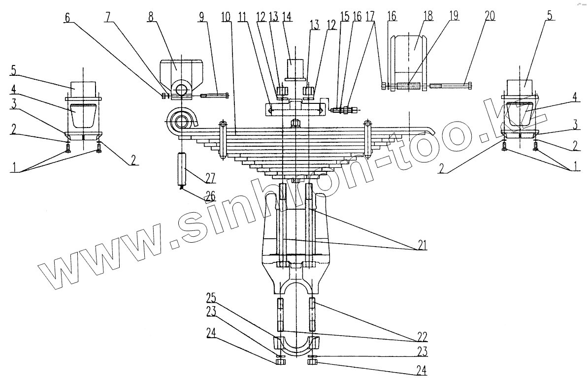 Каталог запасных частей к технике: XCMG XZ16K-XZ50K. XZ16K.58A Rear Suspension (Plate Spring Fixing)