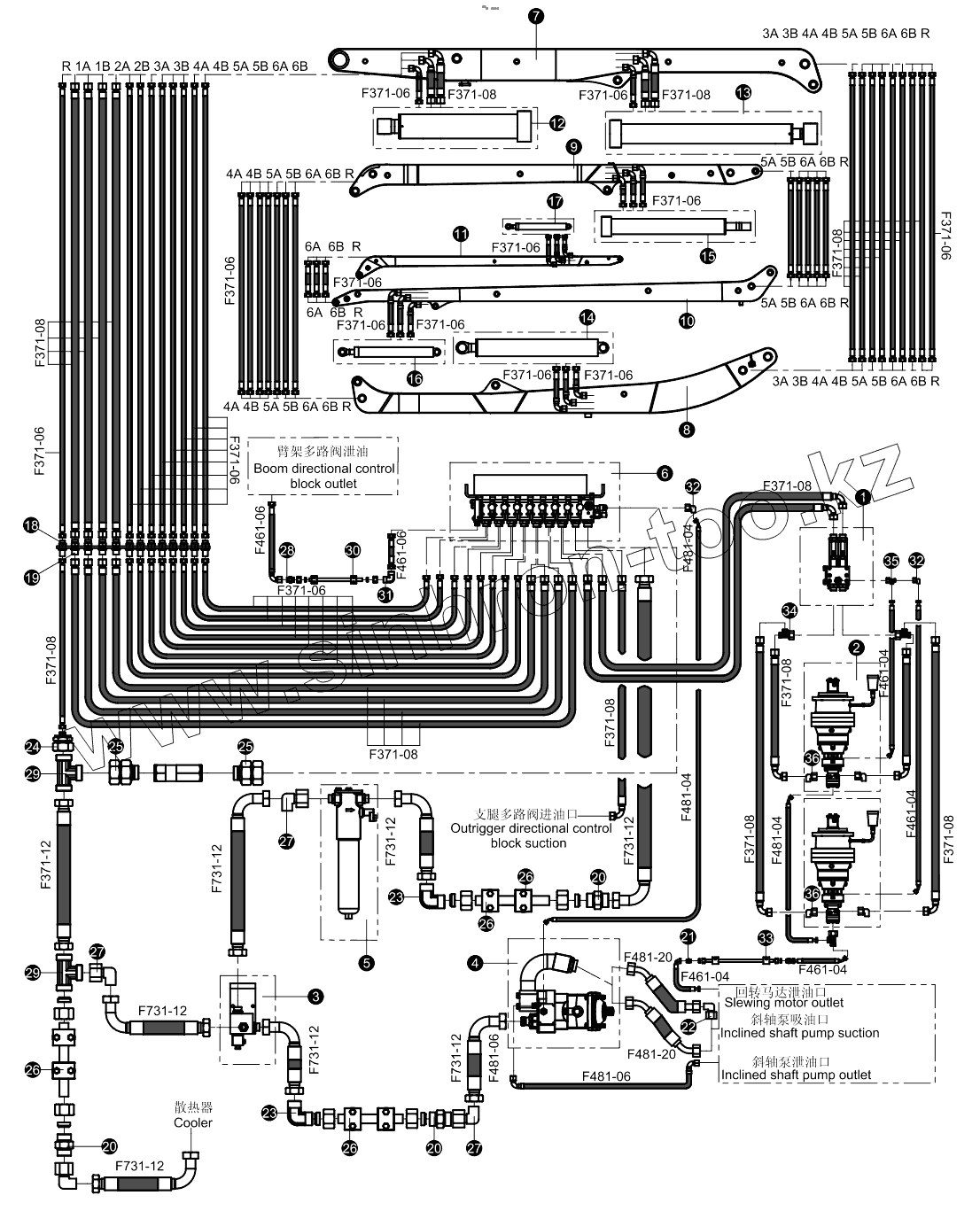 Каталог запасных частей к технике: Zoomlion K56X-6RZ. Pipelaying of boom circuit 001621249A0000000