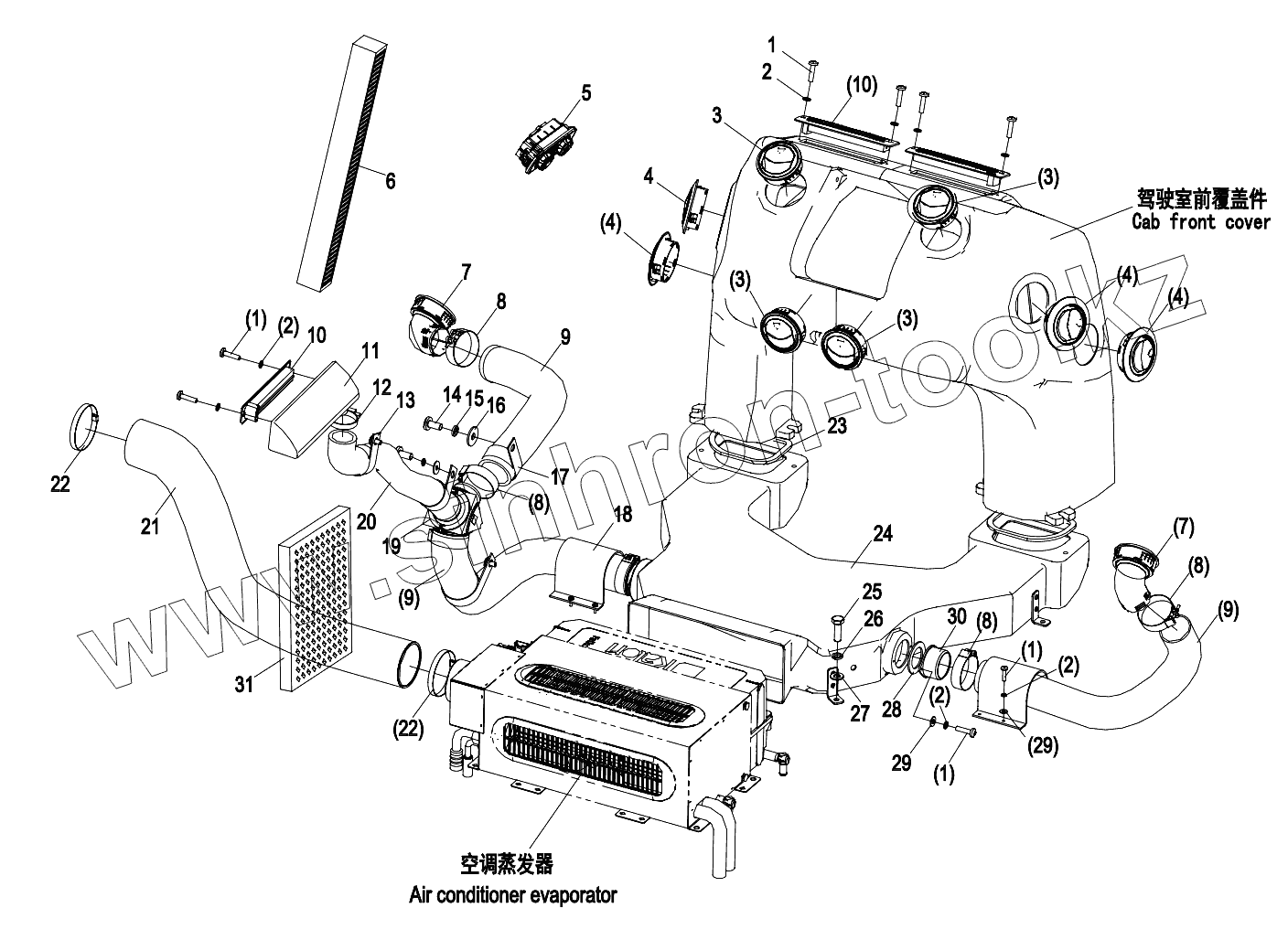 Каталог запасных частей к технике: Zoomlion PL2304. 01572100601430000 Air conditioner canal assembly